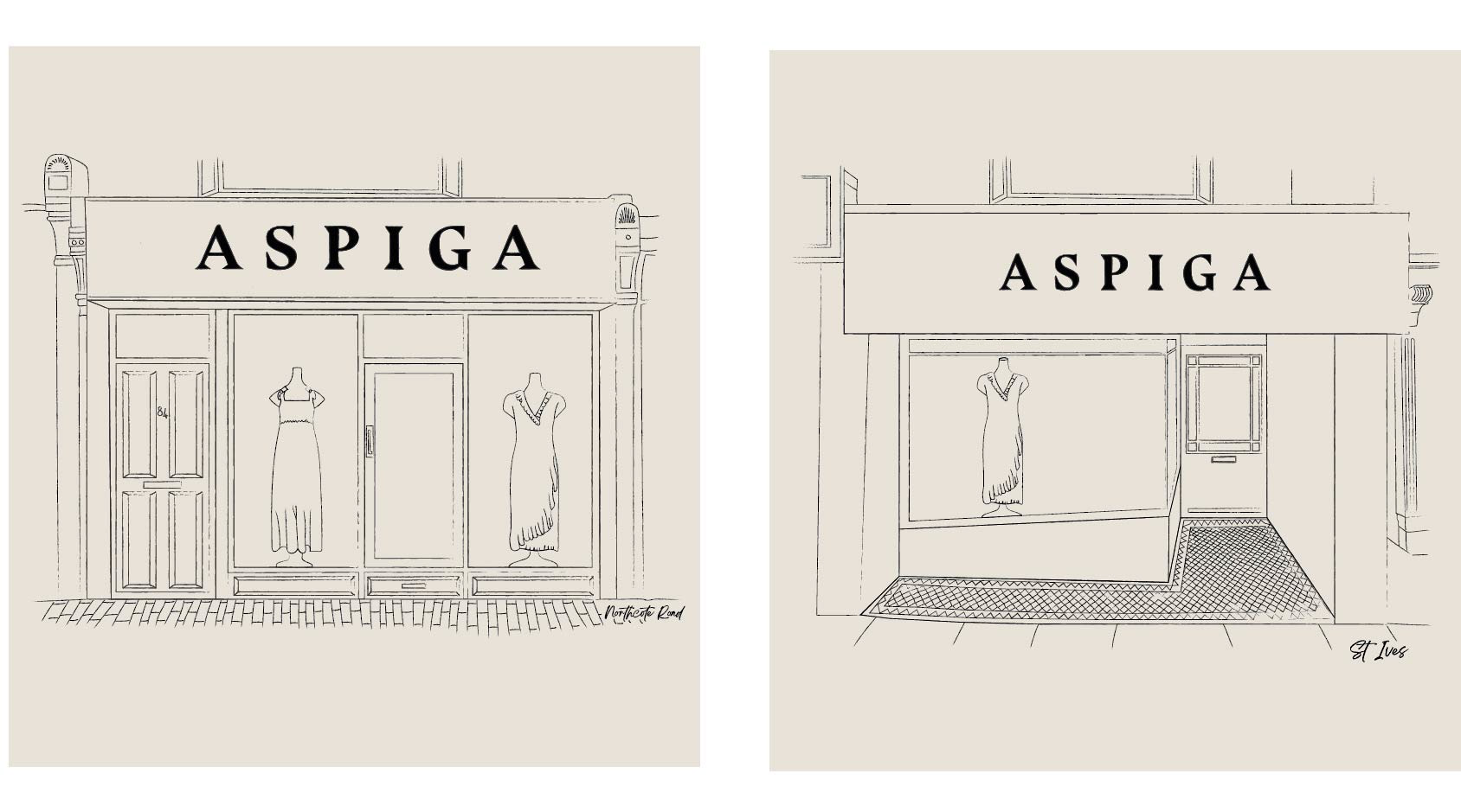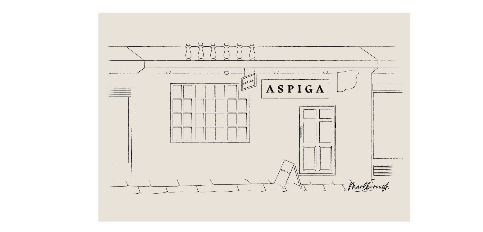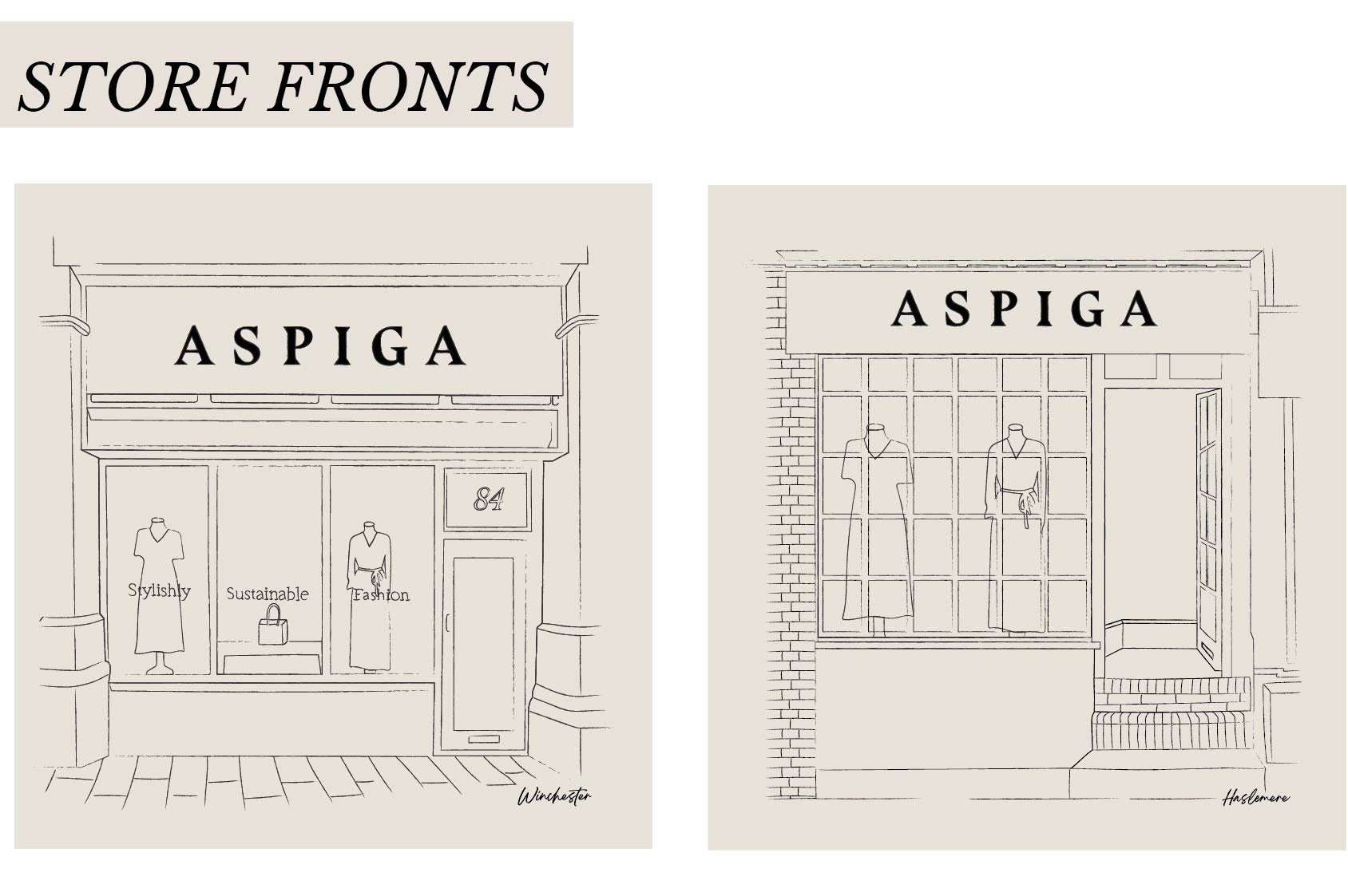 Brand, website and brochure icons designed for Aspiga, as well as store front illustrations for social media use.