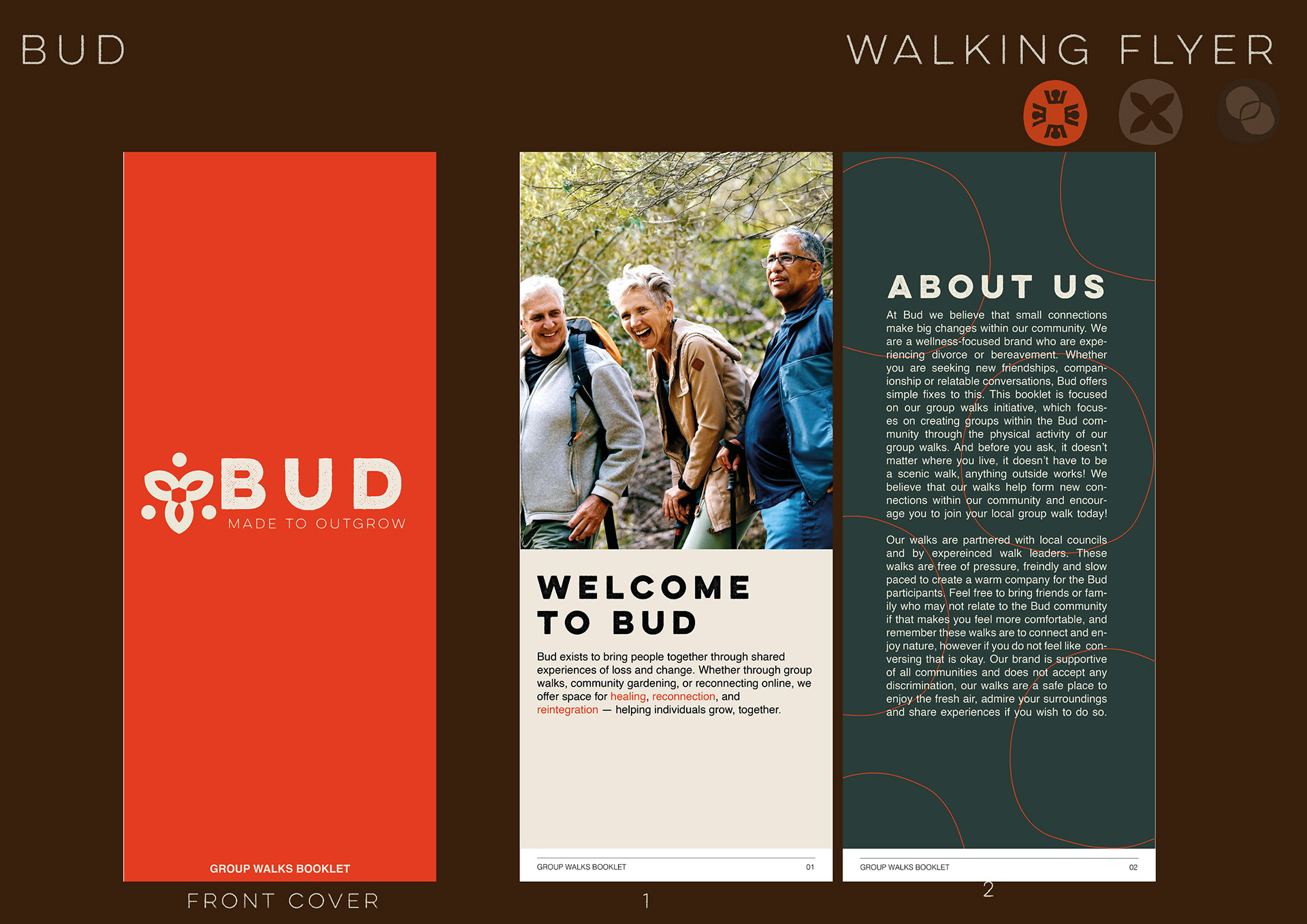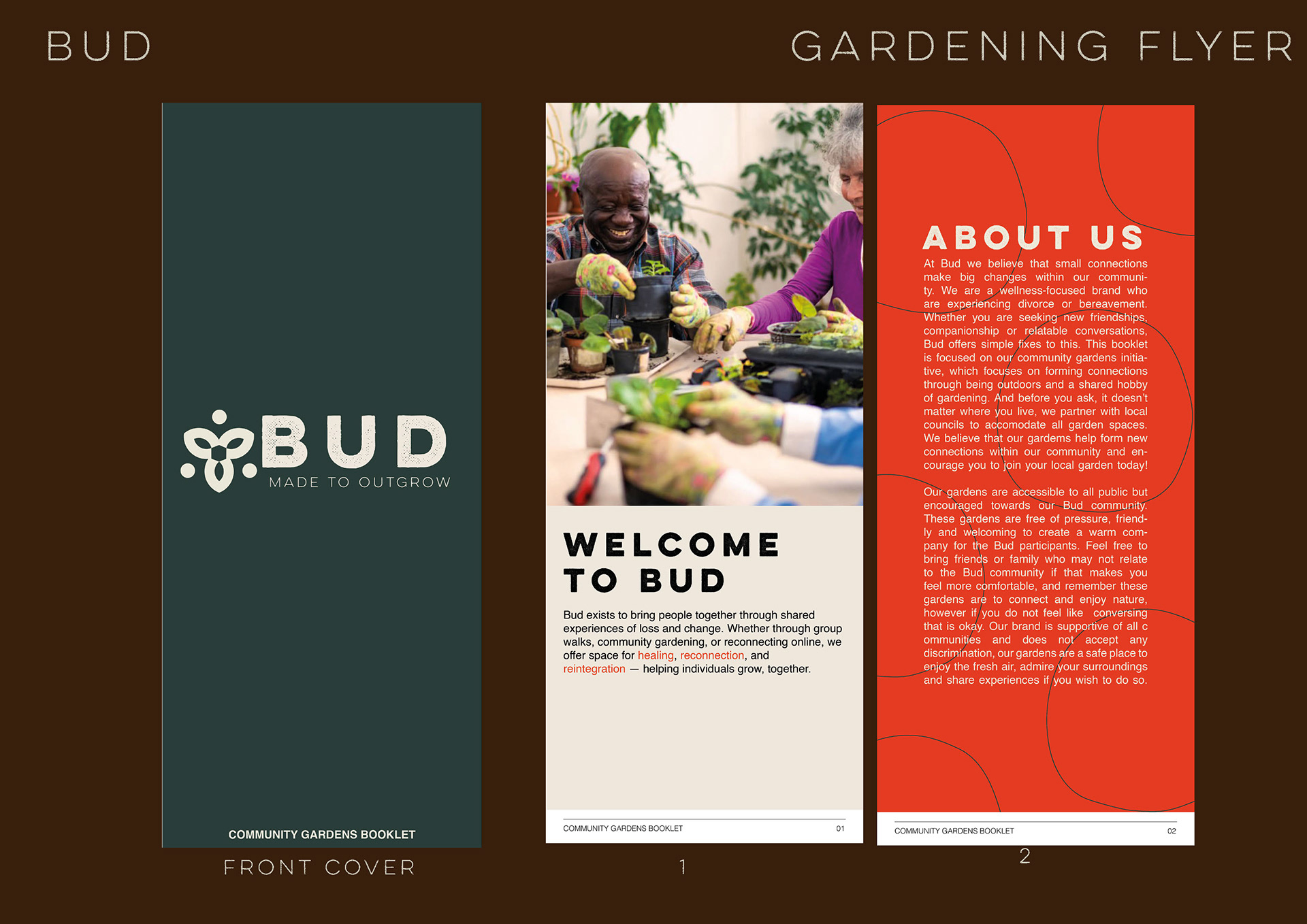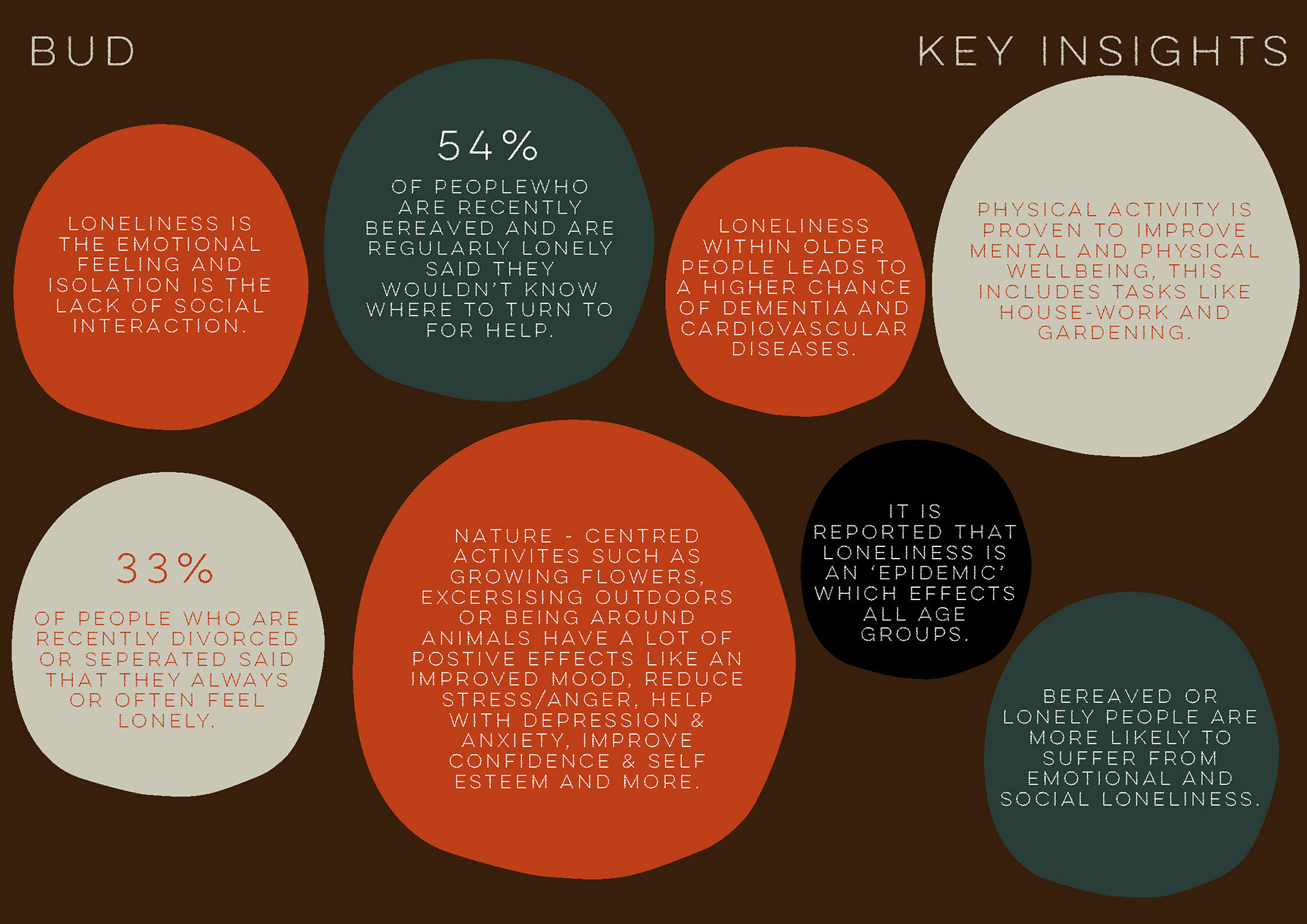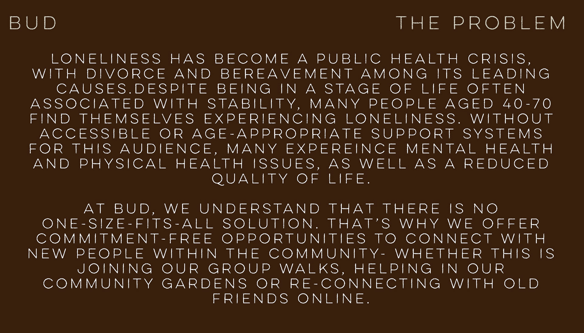 Bud is a wellness brand project in response to the Conran design group brief to create a solution to the issue of people experiencing loneliness due to bereavement or divorce. Bud understands that there is not just one solution to this problem, and offers the opportunities of group walks, community gardens and re-connecting with old friends online for healing, re-connection and reintegration.