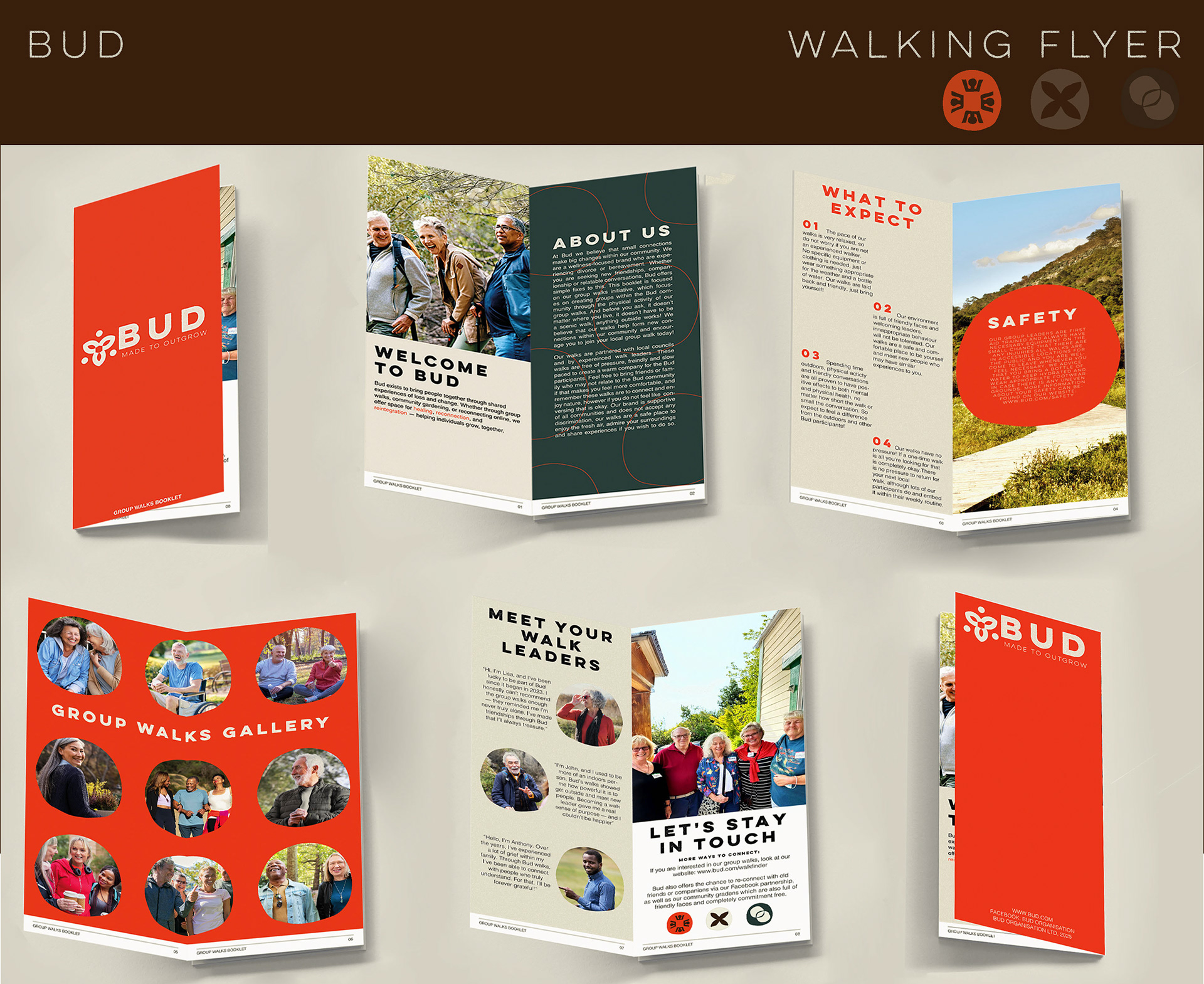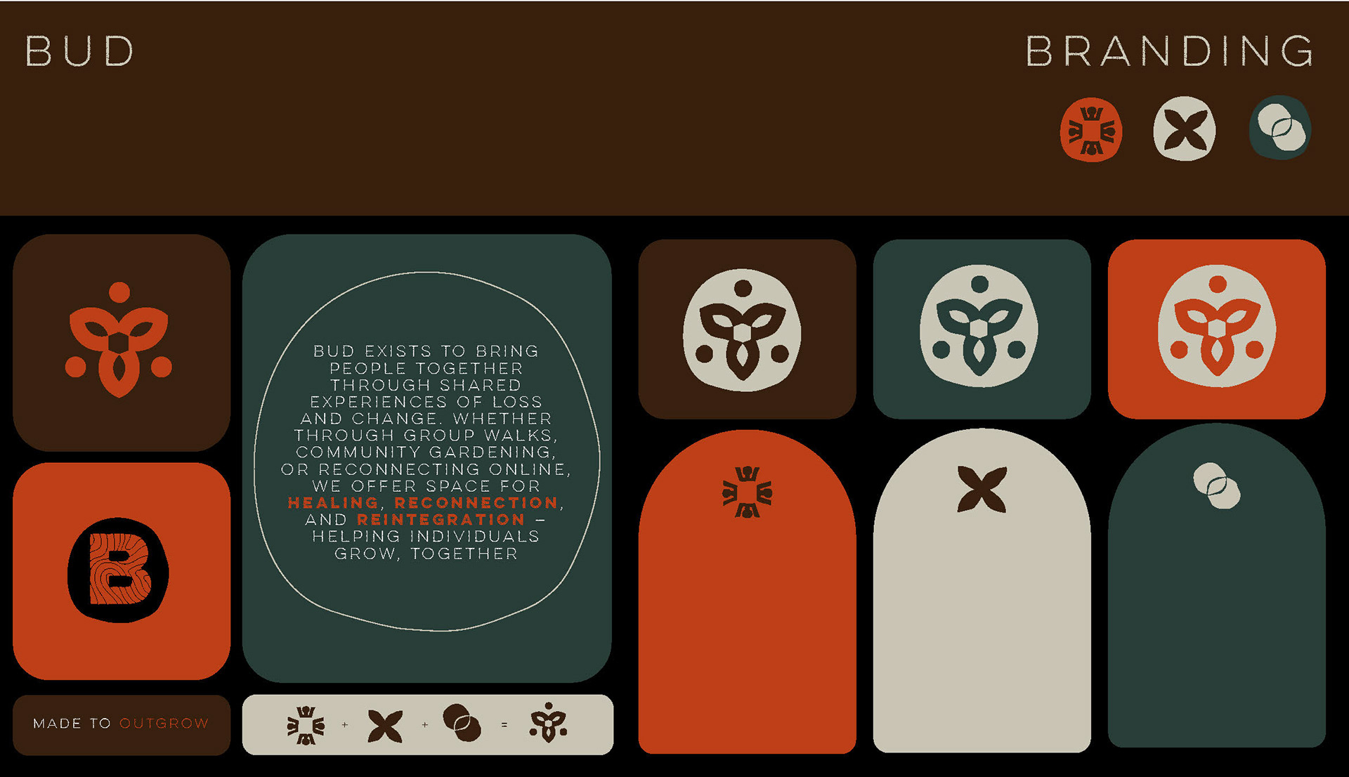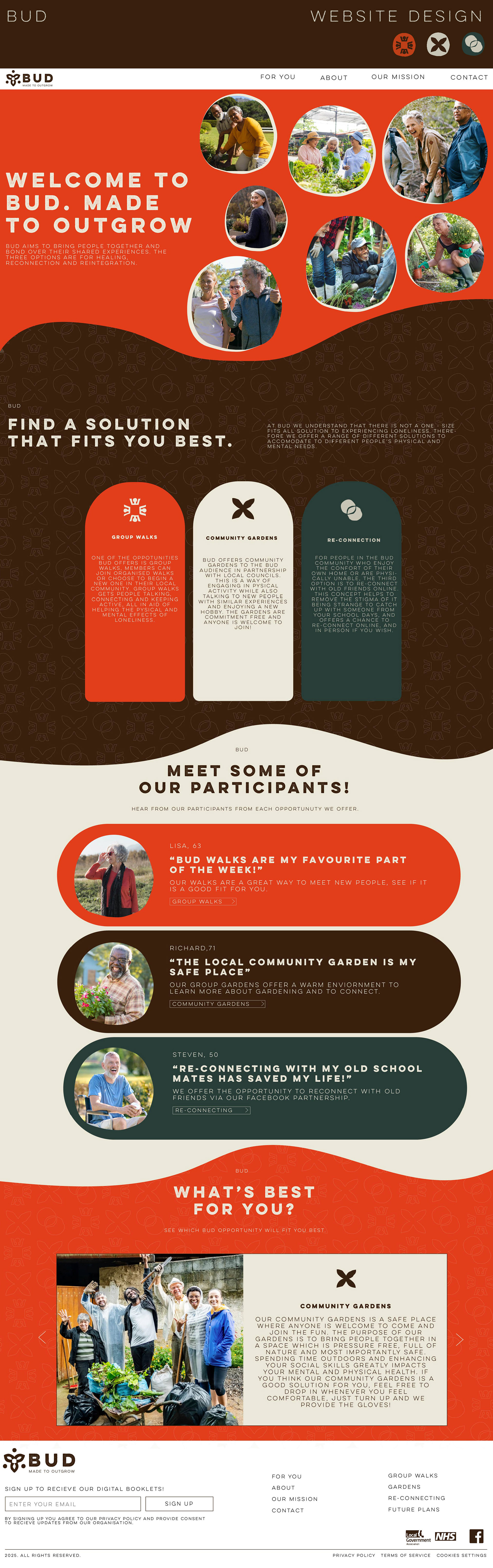 Bud is a wellness brand project in response to the Conran design group brief to create a solution to the issue of people experiencing loneliness due to bereavement or divorce. Bud understands that there is not just one solution to this problem, and offers the opportunities of group walks, community gardens and re-connecting with old friends online for healing, re-connection and reintegration.