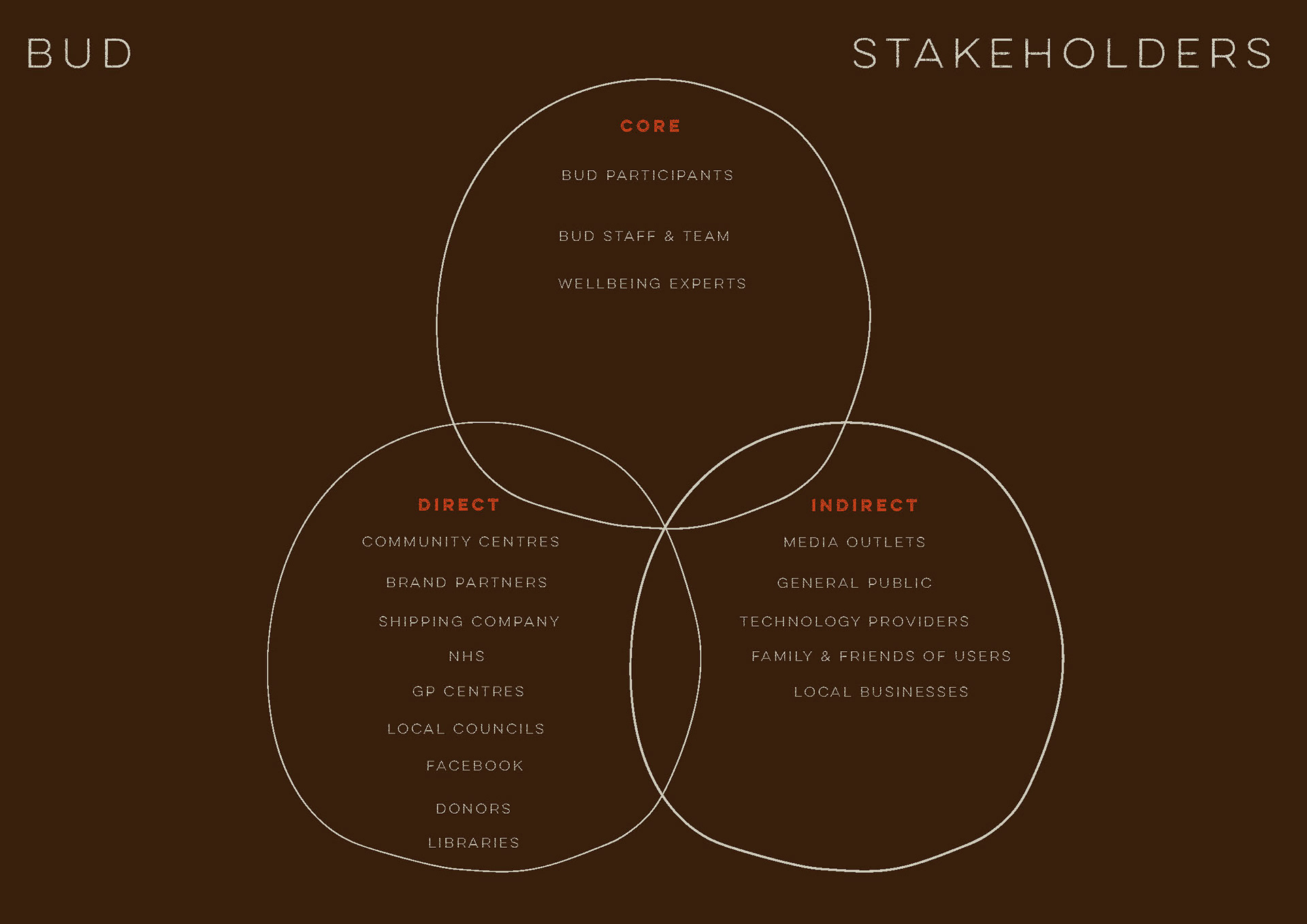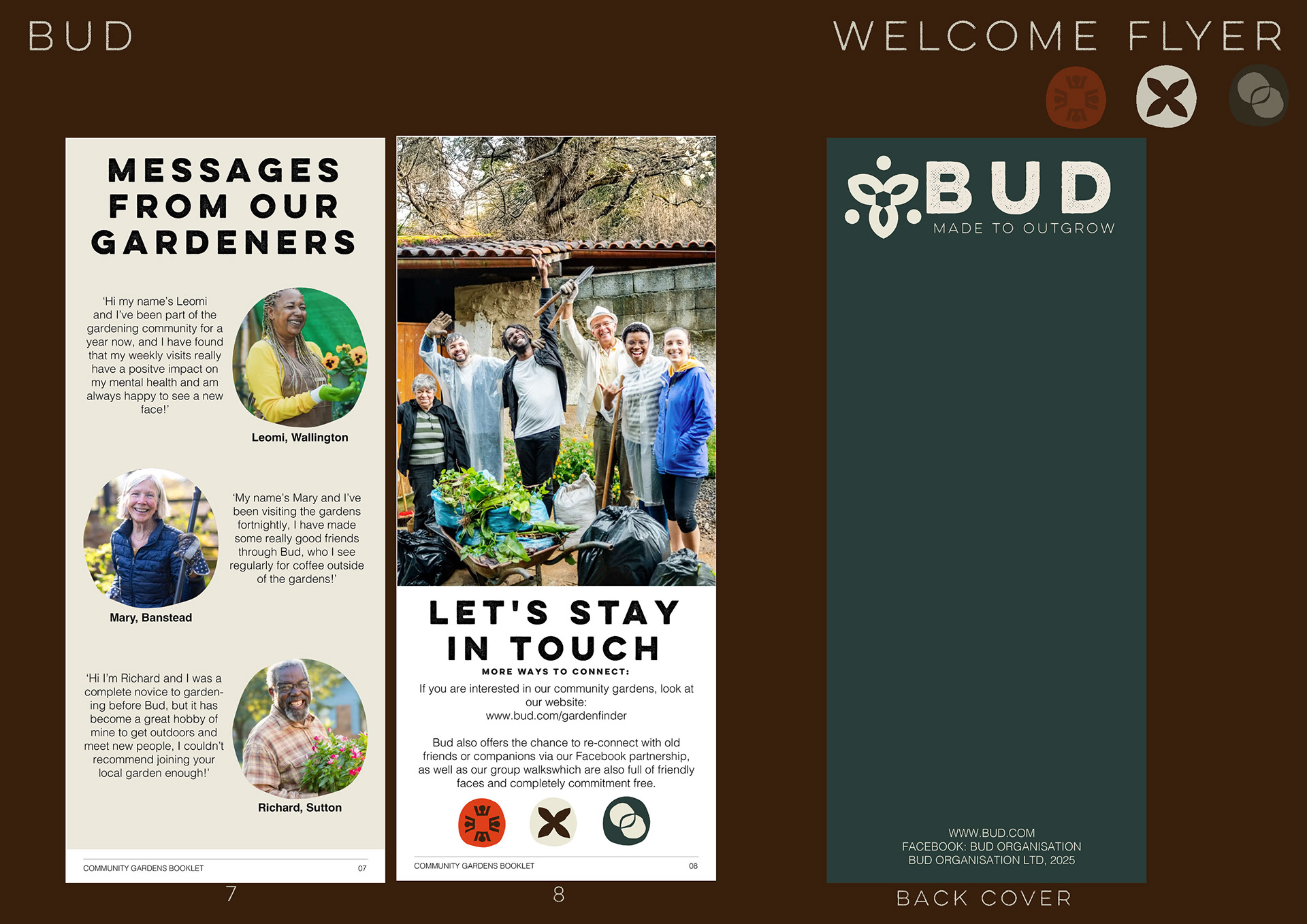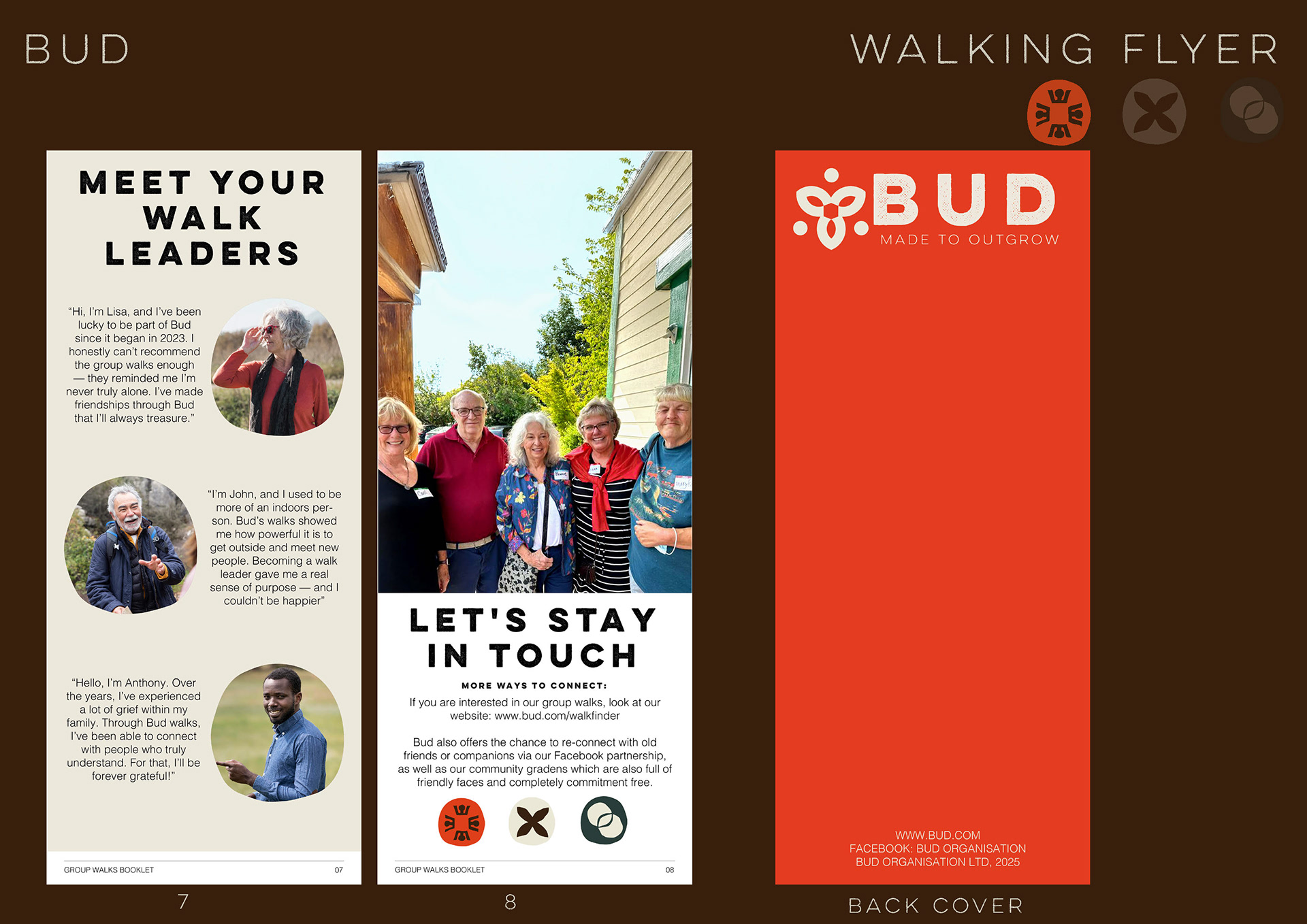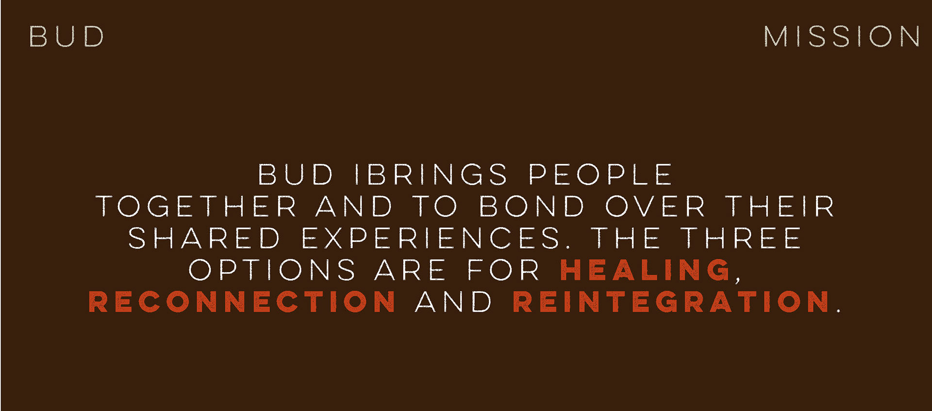 Bud is a wellness brand project in response to the Conran design group brief to create a solution to the issue of people experiencing loneliness due to bereavement or divorce. Bud understands that there is not just one solution to this problem, and offers the opportunities of group walks, community gardens and re-connecting with old friends online for healing, re-connection and reintegration.